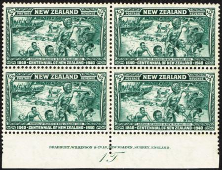 | 1940 Centennial. ½d mint plate block of four (plate 1T). Slightly lower left centred. CP S26a, SG 613. |
