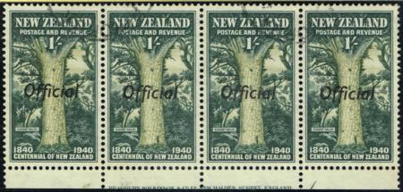 | 1940 Centennial Official. 1/-. Fine used plate strip of four. Trimmed. Catalogue value for mint $1,000.