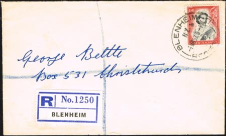 | QEII 1/- on registered plain registered cover (1957). Correct 9d reg. plus 3d postage rate. |
