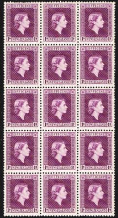 | QEII 1/- Official (coarse paper). UHM block of 15. CP NO27a, SG O166. Catalogue value $120.