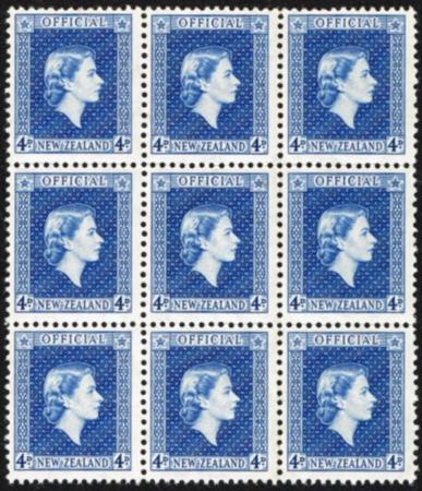 | QEII 4d Official (coarse paper). UHM block of nine. Small gum tone spot plus light fold. CP NO25a, SG O164.