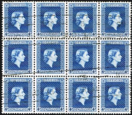| QEII 4d Official (coarse paper). Fine used block of 12. Some perfs have separated. CP NO25a, SG O164. |