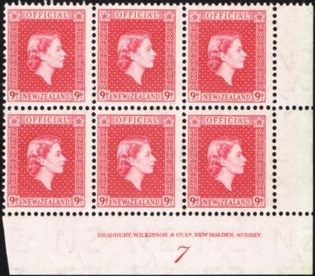 | QEII 9d Official. UHM plate block of six. Left centred. CP NO26a, SG O165. Catalogue value $110.