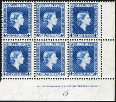 | QEII 4d Official. (coarse paper). UHM plate block of six. Left centred. CP NO25a, SG O164.