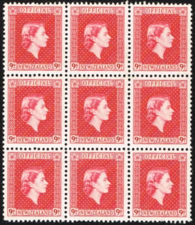 | QEII 9d Official. UHM plate block of nine. CP NO26a, SG O165. Catalogue value $90.