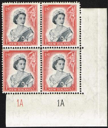 | QEII. 1/-. UHM plate block of four with red misplaced slightly to the left. CP N10a, SG 732. Crease in selvedge.