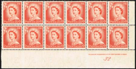 | QEII 3d (stars). UHM plate block of 12 (plate 32). Right centred. CP N5a, SG 727. |