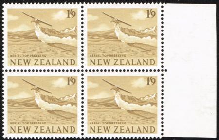 | 1960 Definitives. 1/9d yellow/brown. UHM/LHM block of four with the Row 6/16 retouch in the sky just above the mountain. CP OV15a. |