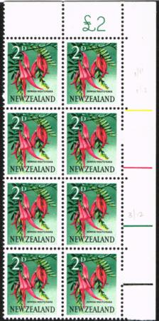 | 1960 2d. UHM (LH in top selvedge) block of eight. Three minor flaws (Rows 1/11, 1/12 and 3/12) plus right hand perfs having three blind perfs (indented but not punched through). CP O3a. |
