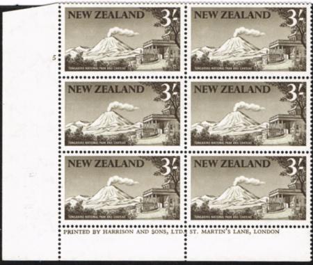 | 1960 Definitives. 3/- Sepia. UHM/LHM Imprint/Plate block of six. Reasonably centred. two small marks on gum. CP O18a, SG 798.