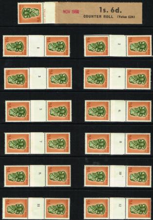 | 1960 definitives. 1/6d coil pairs with the wide margins. Full set of 19 pairs with numbers in black. With start and end papers. LHM. CP OC14a.