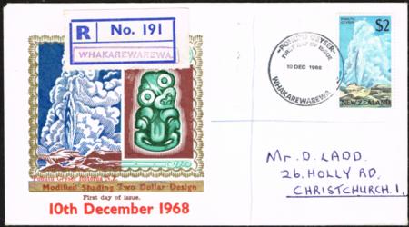 | 1968 $2 multicolour on Illustrated Registered FDC (10 DE 68) to Australia. Posted at Whakarewarewa where the geyser is located. Crean D68.8A.