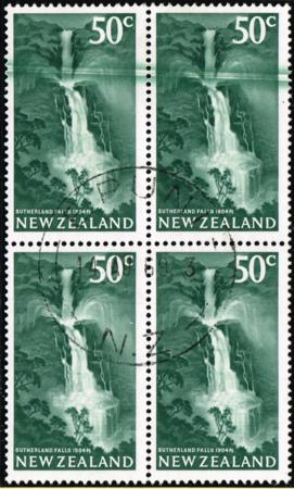 | 1967 Definitives. 50¢. Fine used block of four with green horizontal doctor blade flaw. CP OD16a, SG 860.