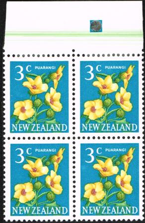 | 1967 Definitives. 3¢. Mint block of four with green doctor blade flaw in selvedge. |