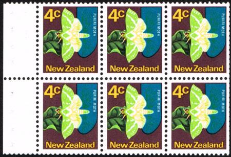 | 1970 Definitives. 4˘ booklet pane (no wmk.). UHM pane of six with 6˝mm shift of the dark green (veins). The dark green is just visible in the blue panels on the right hand side. CP W10b(W), SG 1011.