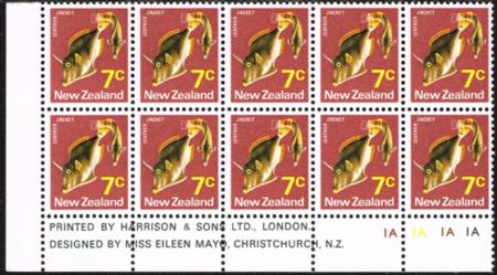 | 1970 Definitives. 7¢ (unwatermarked). UHM plate block of ten (plate 1A1A1A1A). Slightly off centre. Small brown shift upwards. P9b, SG 1014. |