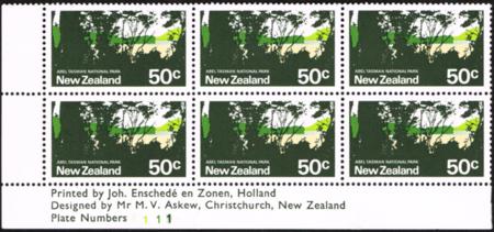 | 1970 50¢ (6th printing). UHM plate block of six (top pane). This printing had bluish gum and no perf hole in bottom selvedge. The foreground is a darker greenish-black shade. CP P19a(6)(3).