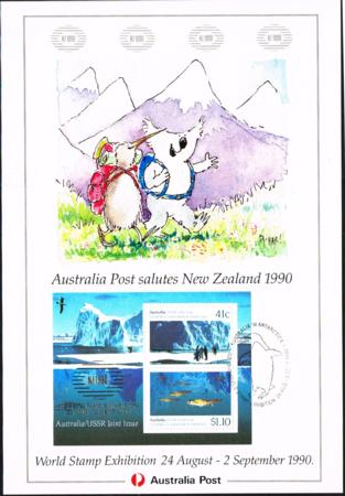| Australia-USSR Joint Issue mini-sheet overprinted for NZ 1990 stampshow. Fine used at show attached to Australia Post show card.