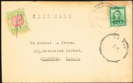 | 1939 NZ short paid postcard to Australia. 1d Australian due tied to pay taxe. |