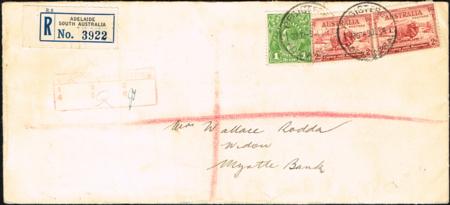 | Australia. Registered cover franked with 1d KGV plus 2d Macarthur pair (9 Nov 1934). |