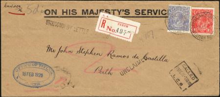 | Australia. 3d and 1½d KGV with 'OS' perfin on OHMS (Perth Office of the Titles) registered cover (18 Feb 1926). 'Unclaimed' and 'Unknown by Letter Carrier' handstamps.