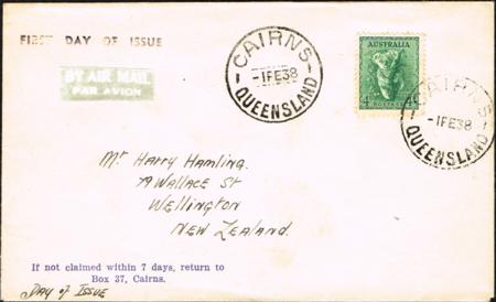 | 1938 4d Koala on FDC (1 Feb). Posted Cairns to New Zealand. |