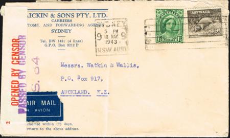 | Australia. Censored advertising (G. Aickin Carriers, Sydney. Transport Service) airmail cover to New Zealand (18 May 1943). Folded.