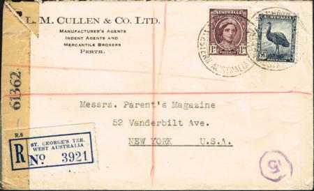 | Australia. KGVI censored advertising (L.M. Cullen & Co., Perth) registered cover to USA (24 June 1944). |
