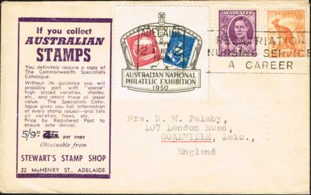| Australia. Printed advertising cover (Stewart's Stamp Shop, Adelaide). Posted 1949 to the UK.