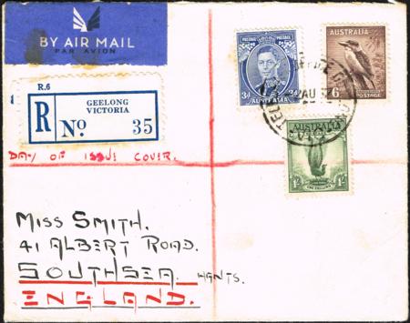 | Australia. KGVI registered airmail FDC to England franked with 3d (die 1), 6d and 1/- stamps. Tone by 'Air Mail' label. |