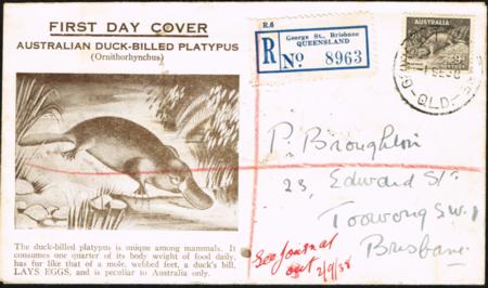 Australia. 9d Platypus. Perf 14 x 13½. Single on illustrated registered FDC.