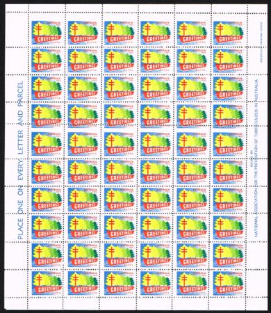 | Australia cinderella label. '1953 Christmas Greetings' UHM sheet of 60. Note: One horizontal perf line is out of place.