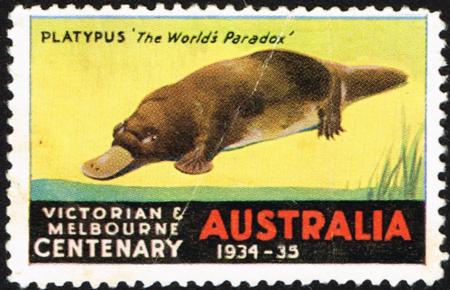 | Australia cinderella label. 'Victorian & Melbourne Centenary' 1934-35. Platypus. Unused. |
