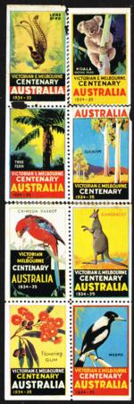 | Australia cinderella label. 'Victorian & Melbourne Centenary' 1934-35. Unused block of labels (two blocks hinged together. Fault (back tones plus perf faults).