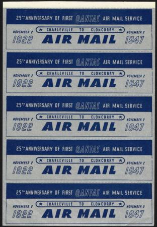 | Australia Airmail Cinderella. 1947 QANTAS "25th Anniversary" label. UHM strip of five with part top selvedge. Scarce in full strip. Frommer 67b2../.