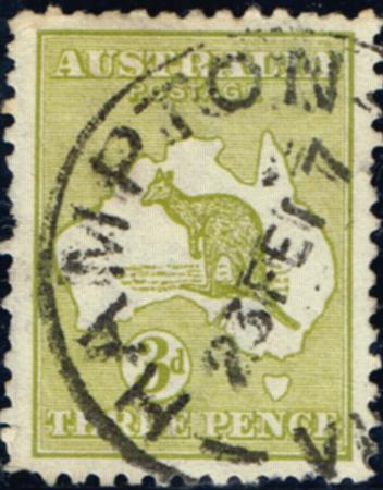 | Australia. 3d Kangaroo (Die I). Third inverted wmk. Used (23 Feb 1917). Well centred. A few short perfs. SG 37cw. |