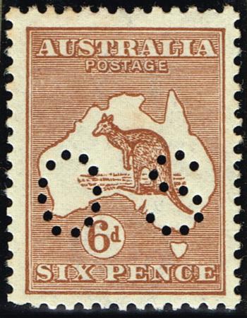 | Australia. 6d chestnut Kangaroo. Third wmk. Perf'd 'OS' UHM. Reasonably centred. Light gum tone spots. SG O76. |