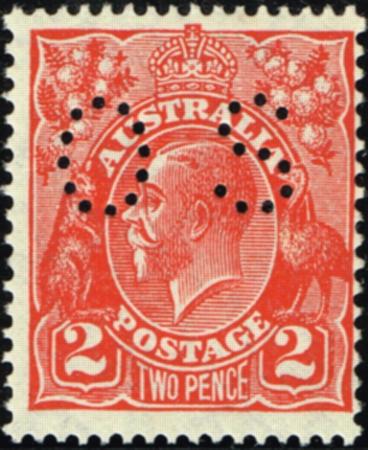 | Australia. 2d red KGV. perf 13½ x 12½. Small multi wmk. Perf'd small 'OS'. UHM. Right centred. SG O104.