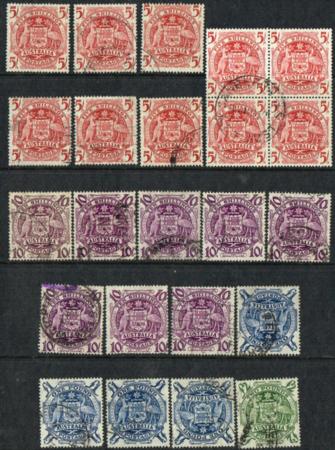 | Australia. 1949 Arms. Used assortment. Ten x 5/-; eight x 10/-; four x £1 and one x £2. |