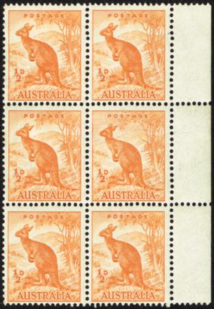 | Australia. ½d Kangaroo. Perf 15 x 14. UHM block of six. 'Foggy Hills' variety. Lower left centred. SG 179da. |