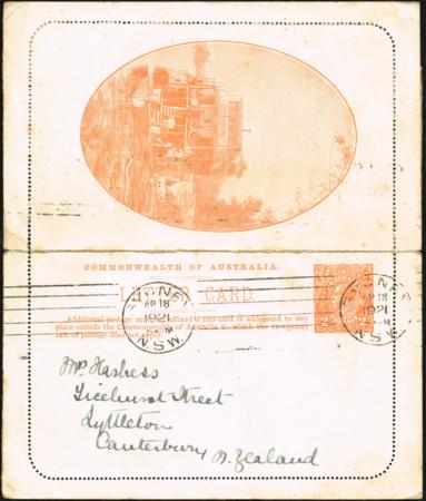 | Australia Postal Stationery. 2d orange KGV off-white lettercard. ACSC LC46(94C), perf 12½. Used (1921) to New Zealand. |