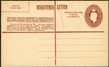Australia Postal Stationery. 9d KGVI registered cover. Unused. ACSC RE35