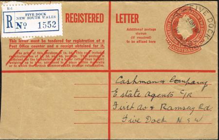 | Australia Postal Stationery. 2/5d QEII registered cover with back setting 1 having eleven obliterating bars. Used (28 May 1962). ACSC RE40B.