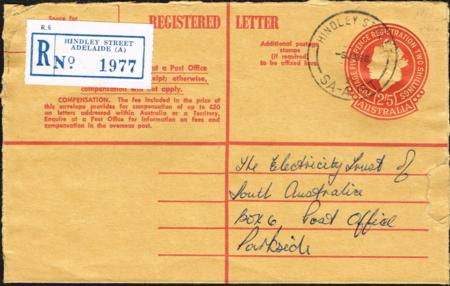 | Australia Postal Stationery. 2/5d QEII registered cover (with Helicon ink). Used (6 JA 1966). ACSC RE44. |