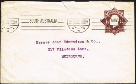 | Australia Postal Stationery. 1½d KGV ('Star') envelope (die 3). Used (21 May 1920). ACSC EP20. Slightly tatty on top. James Marshall & Co (Adelaide) on [torn] 'Knife 5' flap (different flap to as shown in ACSC).