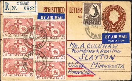 | Australia Postal Stationery. 1/0½d QEII registered cover. Posted Newham (26 Sept 1956) to USA. With additional stamps for postage. ACSC RE37. |