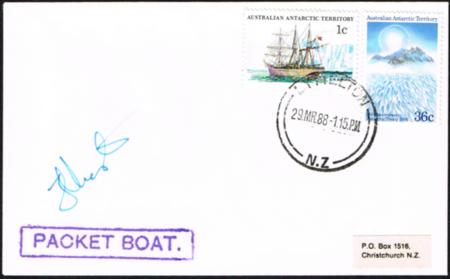 | Australian Antarctic. 1988 Bicentennial Expedition Packet Boat cover to NZ. AAT franking cancelled Lyttelton (29 March 1988). Signed by Jonathon Chester (Expedition Leader).