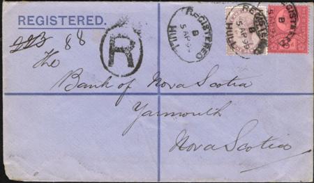 | Great Britain. Registered cover to Nova Scotia (1899). Franked with 1d plus 6d QV. |