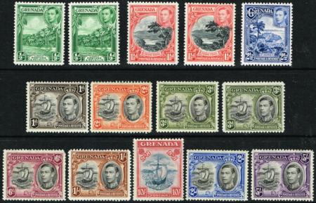 | Grenada. 1938 KGVI. Perf 12½ set of 11 (10/- is perf 12 x 13) plus ten extra shades variations. UHM/LHM. SG 153/163.