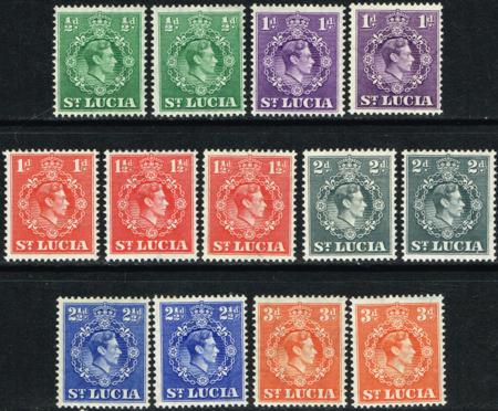 | St Lucia. 1938/48 KGVI. Perf 14½ x 14 set of seven (plus extra shade for six values). UHM/LHM. SG 128/133.